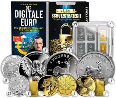 4. Zusätzliche Gratiszugaben: Handsigniertes Buch "Der digitale Euro" von Dominik Kettner, limitierte Sammlerausgaben in polierter Platte mit Auflagen von nur 2.500-5.000 Stück, professionelle Münzhandschuhe und exklusiver Online-Kurs "Edelmetall-Schutzstrategie"