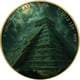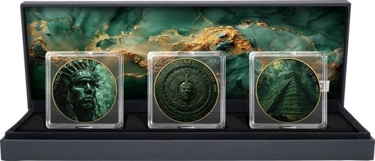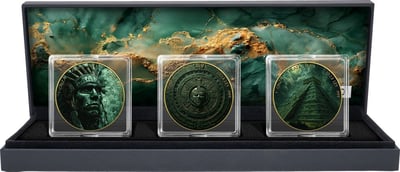 Die mittlere Münze zeigt den aztekischen Kalender, ein Kunstwerk, das mit seiner Komplexität und Symbolik fasziniert. Die Farbgebung in dunklem Metallgrün mit goldenen Akzenten betont die tiefe kulturelle Bedeutung, die in jedem Detail steckt. Die rechte Münze präsentiert eine Pyramide unter einem dramatischen Himmel – ein Bild, das die Macht und das Mysterium der aztekischen Götter einzufangen scheint.