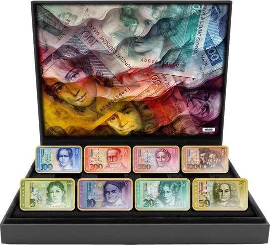 Betrachten Sie die Präsentationsbox, und Sie werden sofort von der Qualität und dem Detailreichtum dieses Sets beeindruckt sein. Die Barren sind nicht nur optisch ein Genuss, sondern auch in der Haptik, denn die Prägung von Heimerle & Meule garantiert höchste Präzision und Feinheit. Die Porträts und architektonischen Elemente auf jedem Barren sind eine Hommage an die Künstler und die kulturelle Bedeutung der D-Mark.