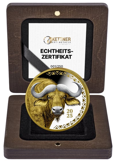 • Motiv: Majestätischer afrikanischer Büffel mit teilvergoldetem Kopf und silbernen Hörnern – Rückseite zeigt die legendären Big Five Afrikas