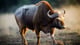 2. Links davon steht ein Büffel mit seinen mächtigen Hörnern