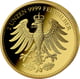 Auf der Rückseite erhebt sich majestätisch der gekrönte Adler mit weit ausgebreiteten Schwingen. Dieses kraftvolle Symbol deutscher Tradition wird von der Umschrift „2 UNZEN 9999 FEINSILBER" begleitet. Ein Eichenzweig zu Füßen des Adlers rundet das harmonische Gesamtbild ab. Die Vergoldung verleiht beiden Seiten einen warmen, luxuriösen Glanz, der die feinen Details der Prägung besonders eindrucksvoll zur Geltung bringt.