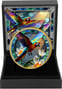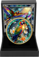 Drehen Sie die Münze um, erwartet Sie ein ebenso atemberaubendes Schauspiel. Ein Papagei im Flug, die Schwingen weit ausgebreitet, coloriert in allen Farben des Regenbogens. Von Rot über Orange, Gelb und Grün bis hin zu Blau und Violett – die Federn zeigen einen schillernden, irisierenden Effekt, der bei jedem Lichteinfall anders wirkt. Kristallartige Blüten und grüne Äste schweben um den fliegenden Vogel herum.