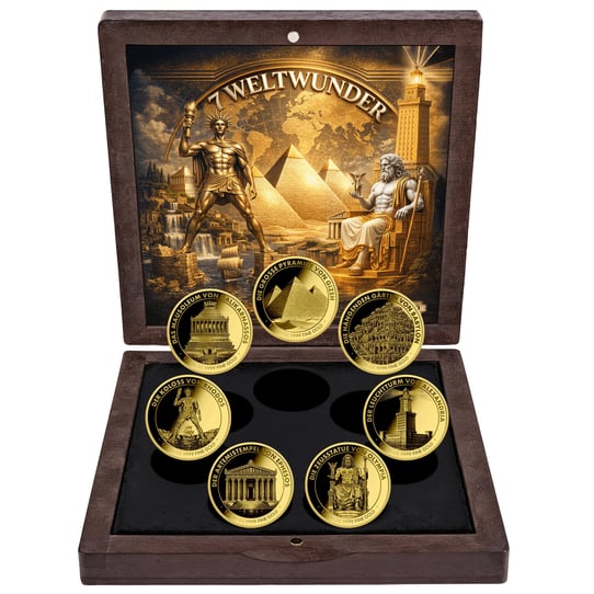 Das Set wird in einer hochwertigen Präsentationsbox aus dunklem Holz geliefert. Das schwarze Samt-Inlay bettet jede einzelne Münze sicher und elegant ein. Der Deckel der Box zeigt eine kunstvolle Illustration aller sieben Weltwunder – ein wahres Kunstwerk für sich. Der bronzefarbene Koloss von Rhodos mit seiner Fackel und Strahlenkrone dominiert das Bild, während die Pyramiden von Gizeh im Zentrum thronen und die majestätische Zeusstatue in Weiß und Silber erstrahlt.