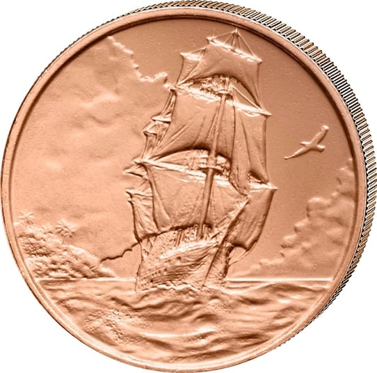Das Motiv dieser außergewöhnlichen Prägung lässt das Herz jedes Sammlers höherschlagen. Ein majestätisches Segelschiff durchpflügt die Wellen des Ozeans – die vollen Segel gebläht vom Wind, bereit für neue Horizonte. Im Hintergrund zeichnet sich eine Küstenlandschaft ab, während ein einzelner Vogel durch den wolkenverhangenen Himmel gleitet. Die Detailtreue ist bemerkenswert: Jede Takelage, jede Welle wurde mit höchster Präzision in das warme Kupfer eingraviert.