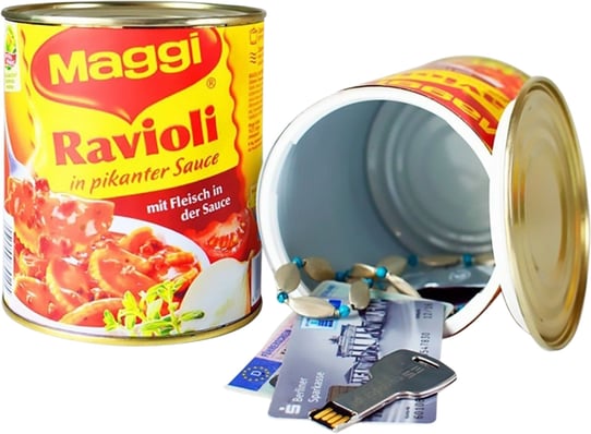 Perfektes Tarnobjekt: Täuschend echte Ravioli-Dose aus Aluminium, ideal zur unauffälligen Wertverwahrung